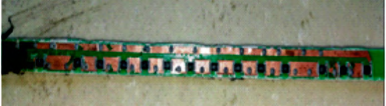 排查PCB板是否存在短路,需要暴露出PCB板布線面,經(jīng)環(huán)氧樹脂溶解劑浸泡后的PCB板如圖3所示,焊點(diǎn)光滑牢固,且未見連焊現(xiàn)象,可以排除PCB板短路問題。由于溶解劑對干簧管玻璃有腐蝕作用,經(jīng)浸泡后的干簧管已損壞。